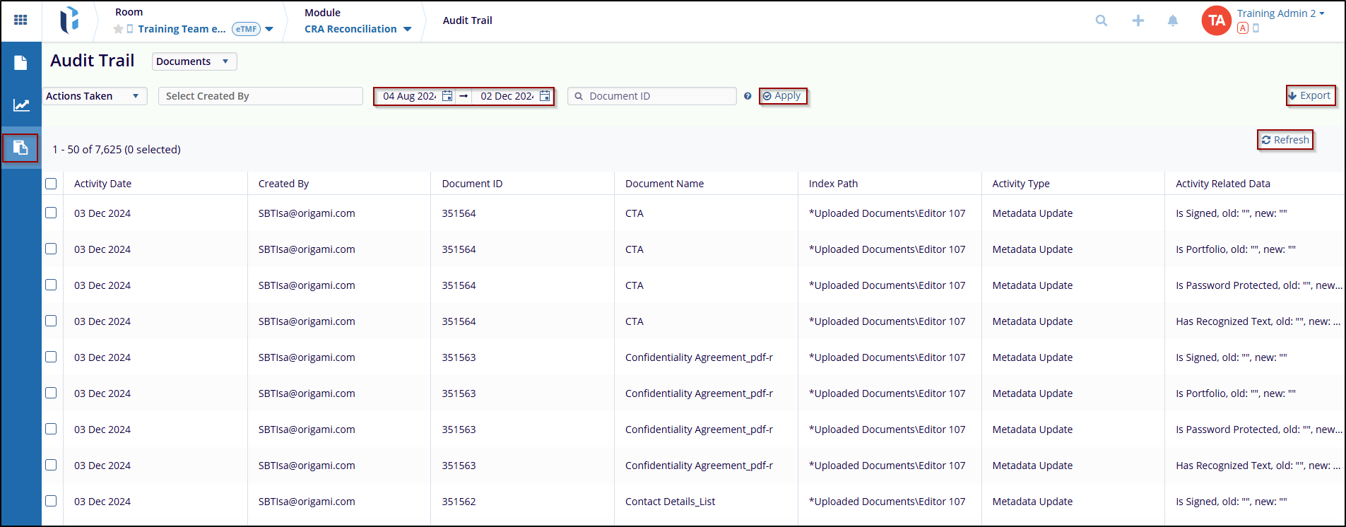 Refer to the Audit Trail from the eTMF Module for a more detailed description of these options.
