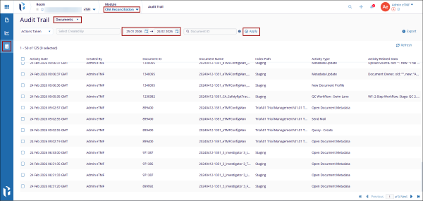 By default, the audit trails grid pane is empty, and the details are displayed only after entering and applying certain parameters and criteria. The audit trail functionality is available for users with Administrator access.