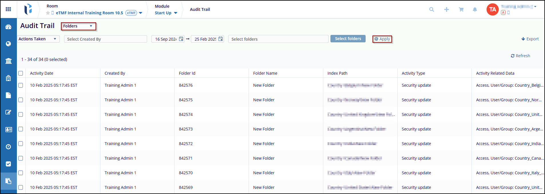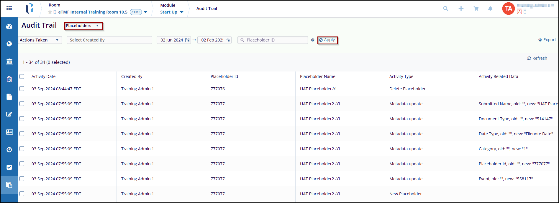 User Interface for Start-Up and eTMF documents: When the audit trail for Start-Up and eTMF Documents is retrieved, the data is presented in the following columns.