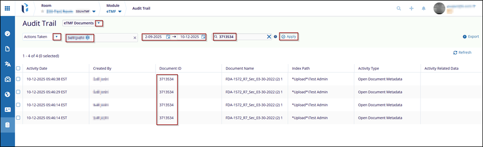 - On the Audit Trail screen, specify a parameter from the available dropdown options i.e., eTMF documents, Start-Up Documents, Start-Up and eTMF Documents, Folders, Placeholders and Users.