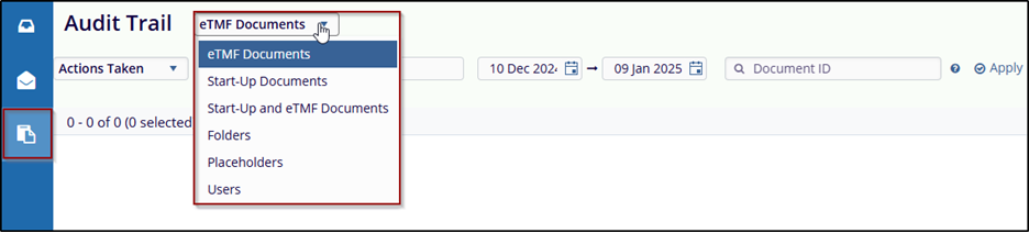 - Use the Record Type dropdown (default is eTMF Documents) to choose the type
