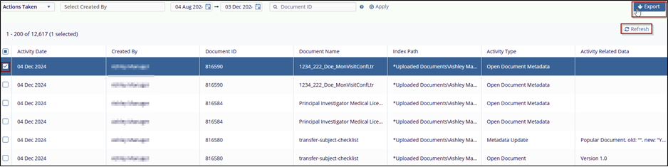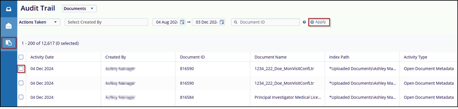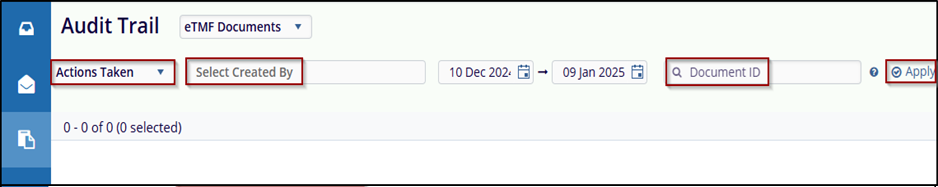 - Select an option from the Actions Taken dropdown to filter the audit trail by a specific action (e.g., Delete Document, Document e-mailed, copy document from room, etc.).