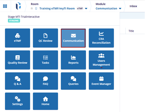 The Communications module is used to capture and manage study-related communications. Emails sent to the Communications Inbox are automatically converted to PDF format. Study room users are required to review the received messages in the Communications Inbox to assess their relevance to the study before adding them to the room’s QC workflow. The module can be accessed from the Navigation Grid in the upper-left corner of the screen.
