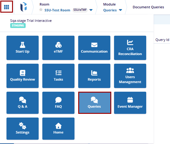 Users can access this module from the Navigation Grid' in the upper-left corner of the screen, where the Queries Module is listed.