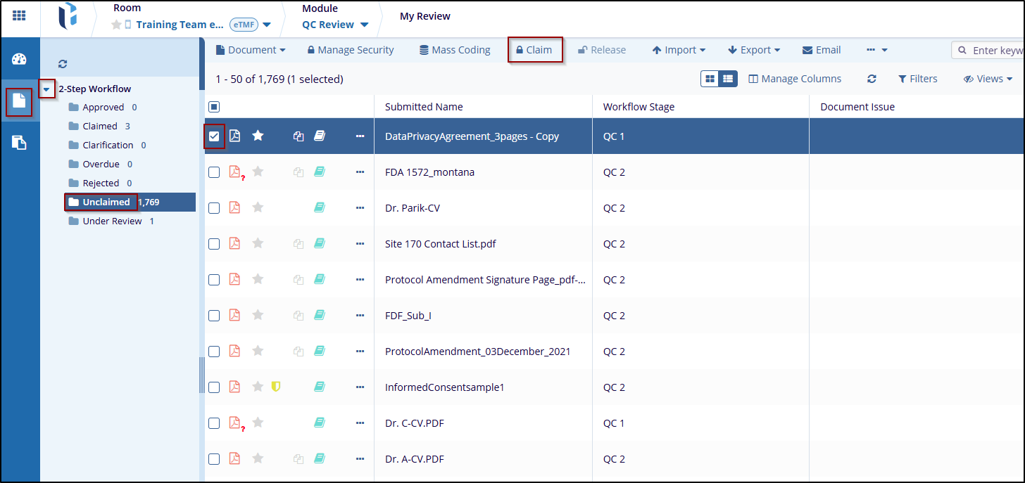 - Check the checkbox of the documents to be claimed. The user could claim one document at a time, but selecting multiple documents is far more efficient.