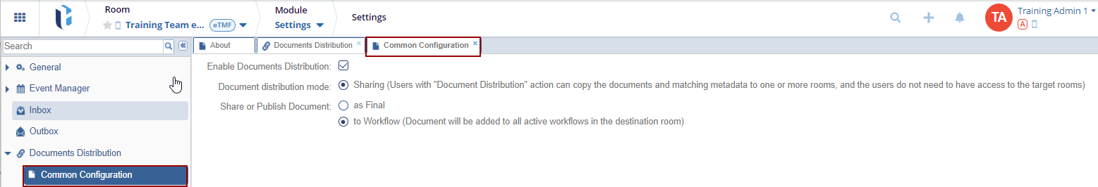 This option allows users to enable or disable the Document Distribution function and specify whether shared documents will be directly published as final documents in the target room or require processing through the room’s QC workflow before being finalized.