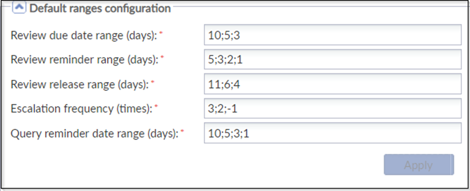 Default ranges configuration: Here the user can specify date ranges that would apply to your workflow.