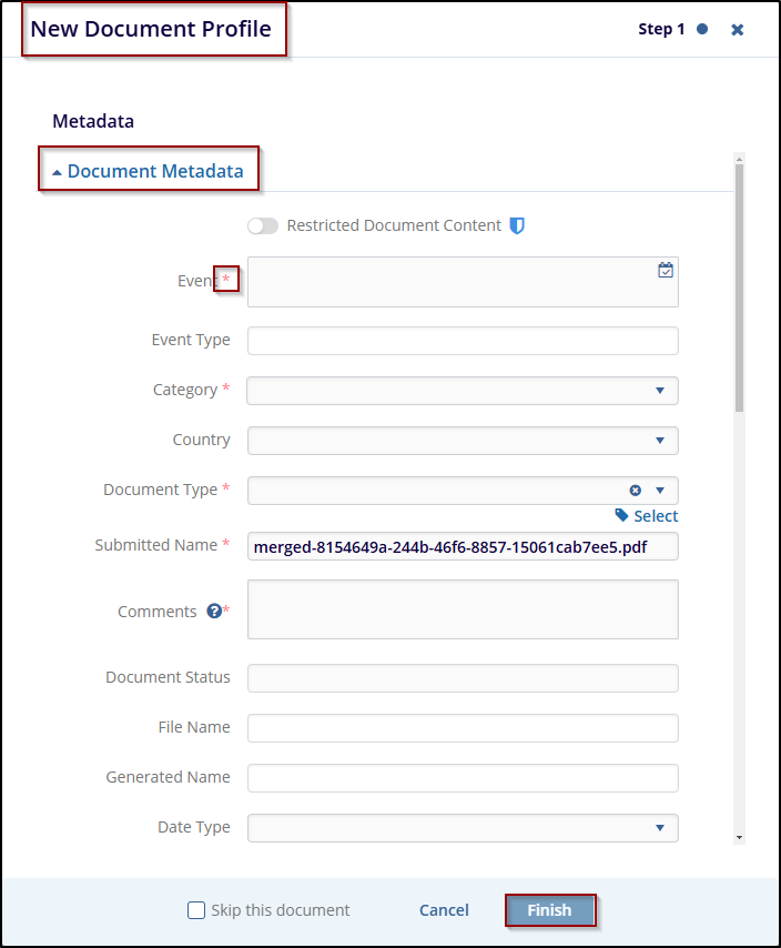After entering the necessary metadata, click Finish to complete the document creation process.