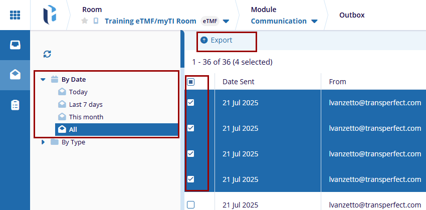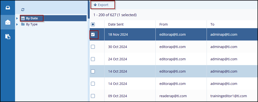 - After selecting the desired emails, click the Export button at the top of the screen.