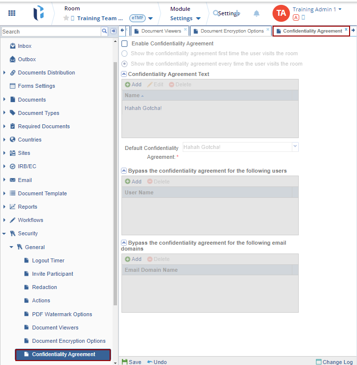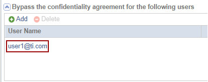 - The selected user gets added to the ‘Bypass the confidentiality agreement for the following users.