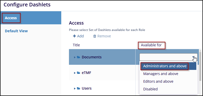 The Configure Dashlets allows administrators to manage the availability and visibility of dashlets on the dashboard for different user roles. Dashlets are individual components that display specific data or functionality, such as documents, users, or key metrics, making the dashboard customizable and role-specific.