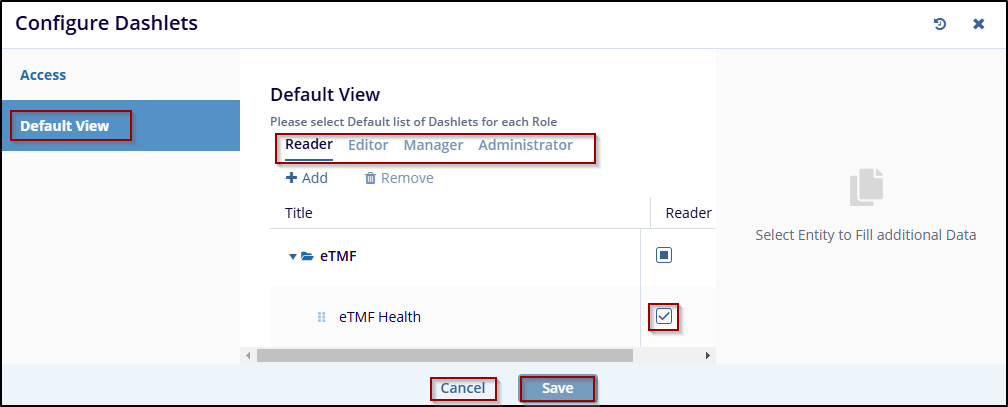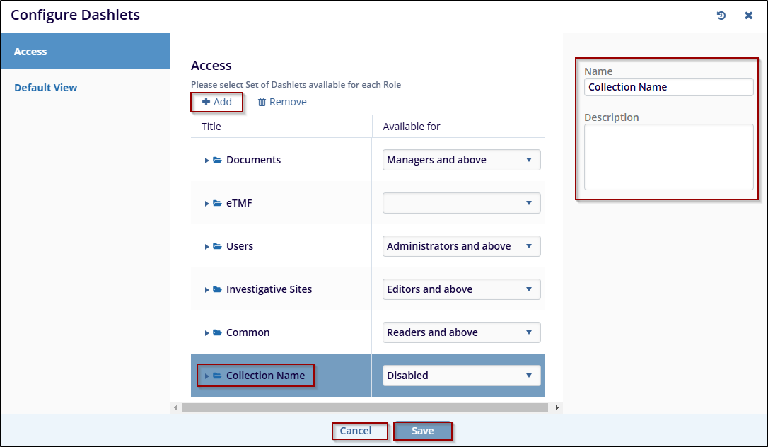 - Switch to the Default View tab, and select the required and appropriate checkboxes for the roles mentioned – Reader, Editor, Manager, Administrator, and Disabled.