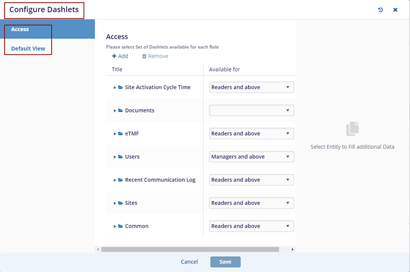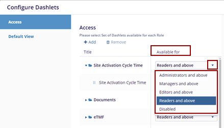 The Configure Dashlets allow administrators to manage the availability and visibility of dashlets on the dashboard for different user roles. Dashlets are individual components that display specific data or functionality, such as documents, users, or key metrics, making the dashboard customizable and role-specific.