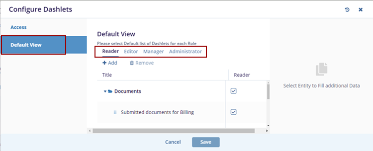 - Switch to the Default View tab, and select the required and appropriate checkboxes for the roles mentioned – Reader, Editor, Manager, and Administrator.