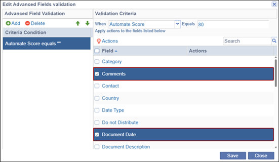 - This means that when users upload a document and the configured Automate Score for that document type is 80, they are required to enter values in the Comments and Document Date fields before they can proceed.