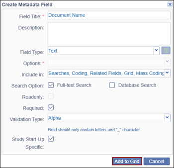 - On the Create Metadata Field pop-up window, fill in all the required fields.