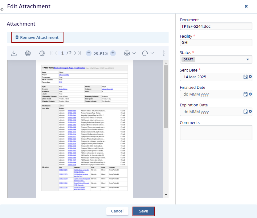- Click the Remove Attachment button. The existing attachment gets removed.
