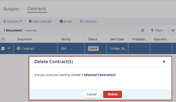 - The Delete Budget(s) pop-up window is displayed with the Cancel and Delete buttons.