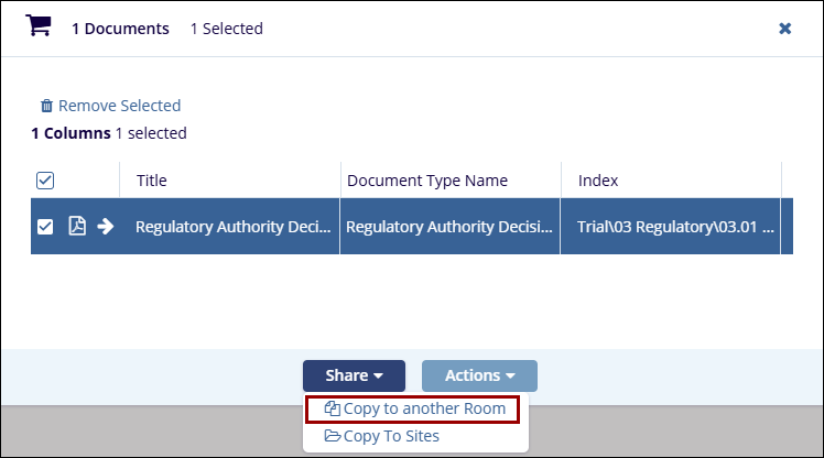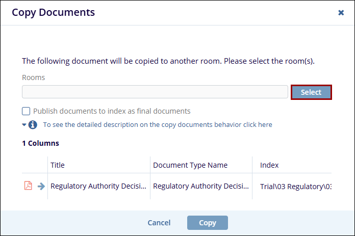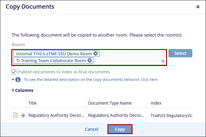 Trial Interactive allows a Cross-Study Copy of Documents through this functionality. When users select the Copy to Other Rooms option from the Documents Cart, selected documents as well as their metadata will be copied to other rooms.