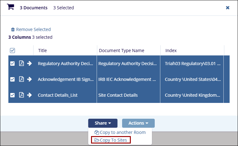 Administrators can access the documents cart to avoid copying documents, such as training documents, individually across different investigative sites.