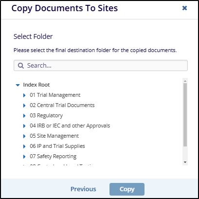 - Select a folder and click on the Copy button. The documents are copied to the Investigative Site folder.
