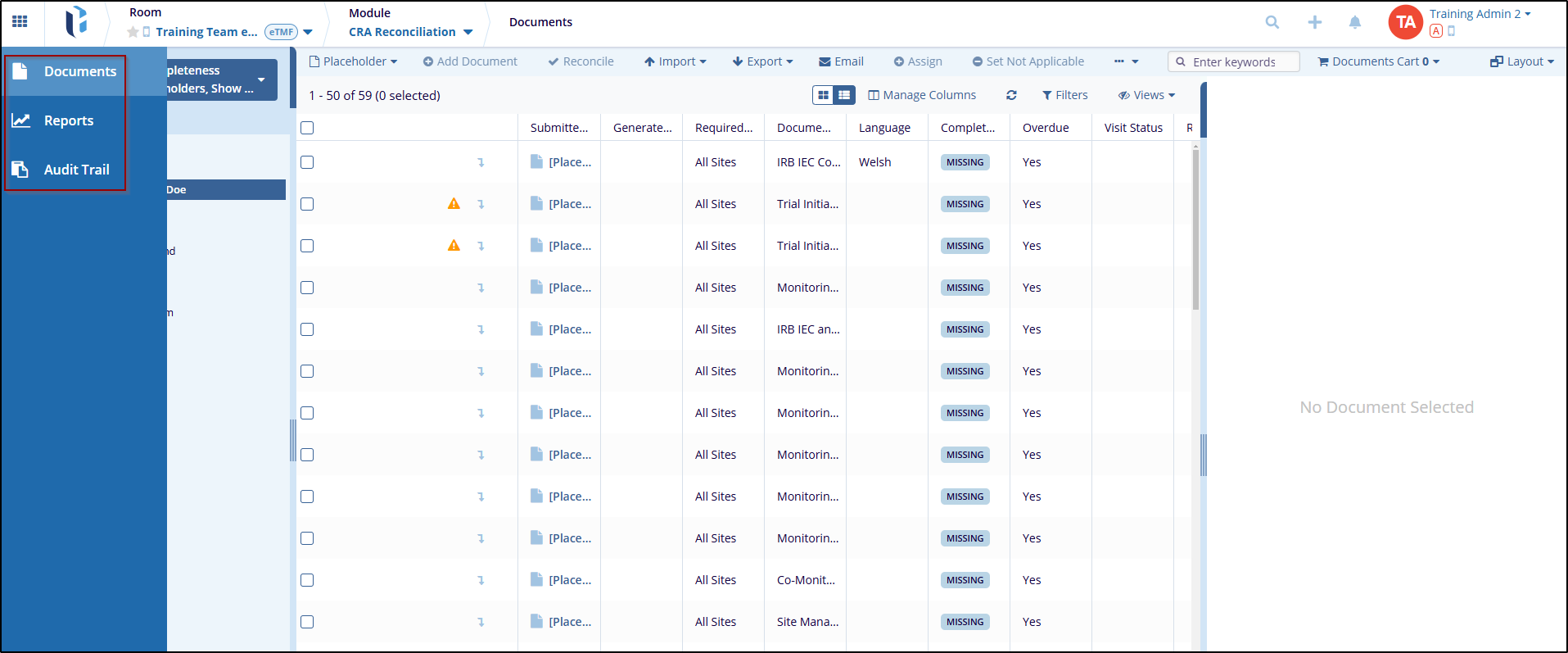 - Documents: This allows the CRA to mark the documents as verified, missing in eTMF, missing in ISF, or add a placeholder for an expected document as part of the reconciliation process.