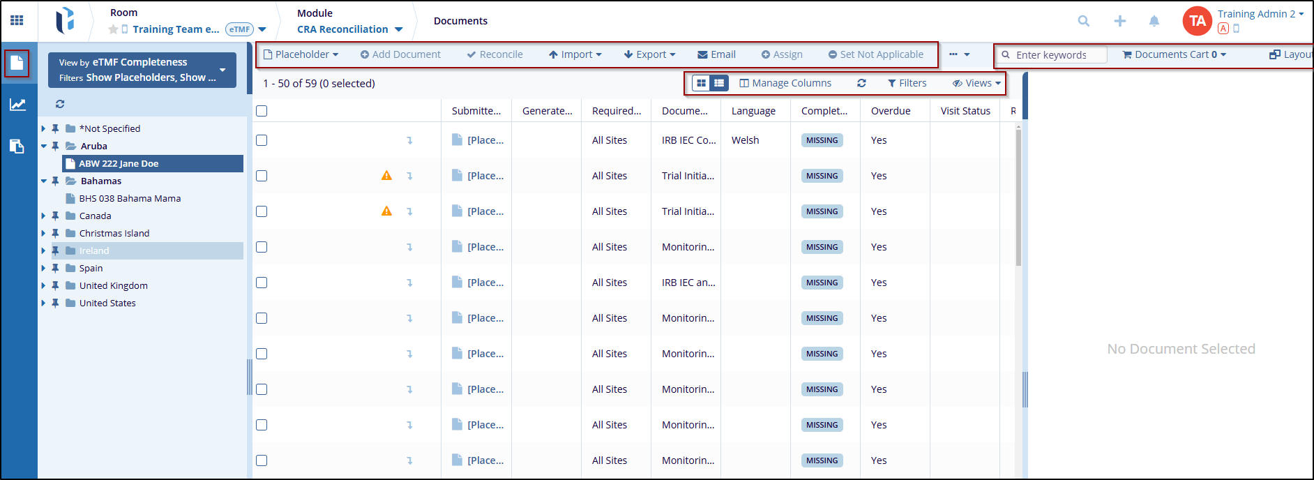The top menu ribbon provides quick access to tools that include Placeholder, Add Document, Reconcile, Set Not Applicable, Export, Assign, Document Cart, Layout, etc.