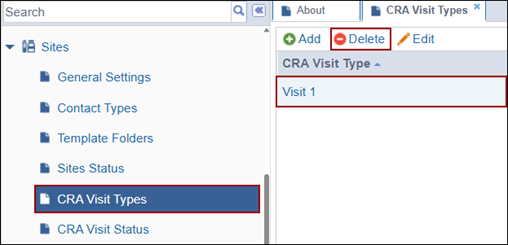 To delete a visit type, select the visit type and click Delete.