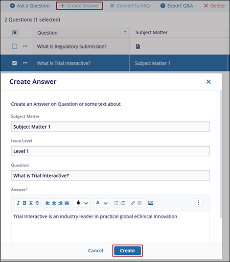 Administrator users and those users indicated as Subject Matter Experts may create answers to questions in the Q&A module.