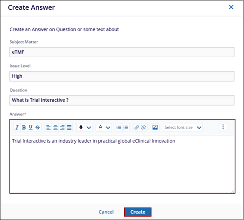 - In the Create Answer window, mandatorily enter the required response in the Answer field.