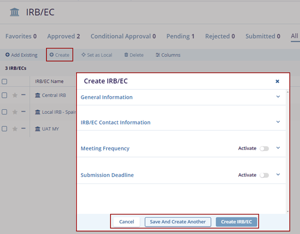 - Click the Create IRB/EC button displayed at the bottom of the popup window.