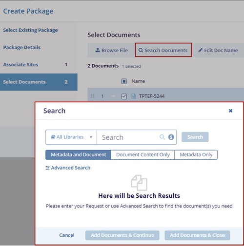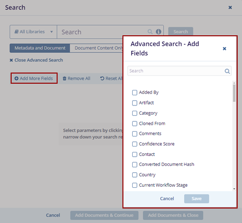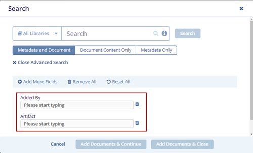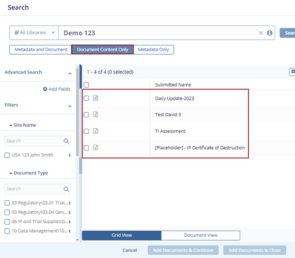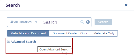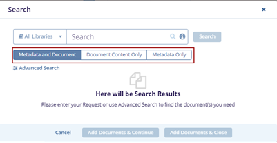 Note: The Metadata and Document tab is pre-selected by default. Choose Document Content Only or Metadata Only if you want to filter the results accordingly.
