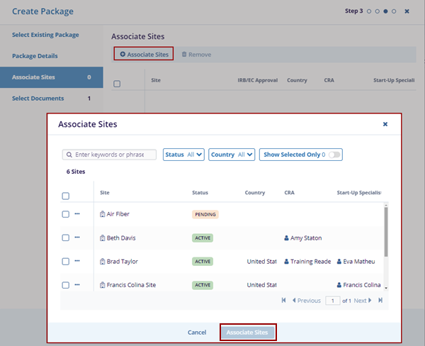 Show Selected Only: A toggle button that displays only sites filtered by Status and Country.