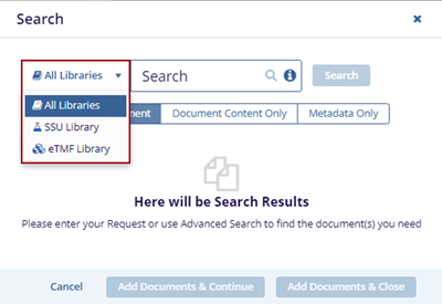 Expand the All-Libraries arrow to search from SSU Library or eTMF Library.