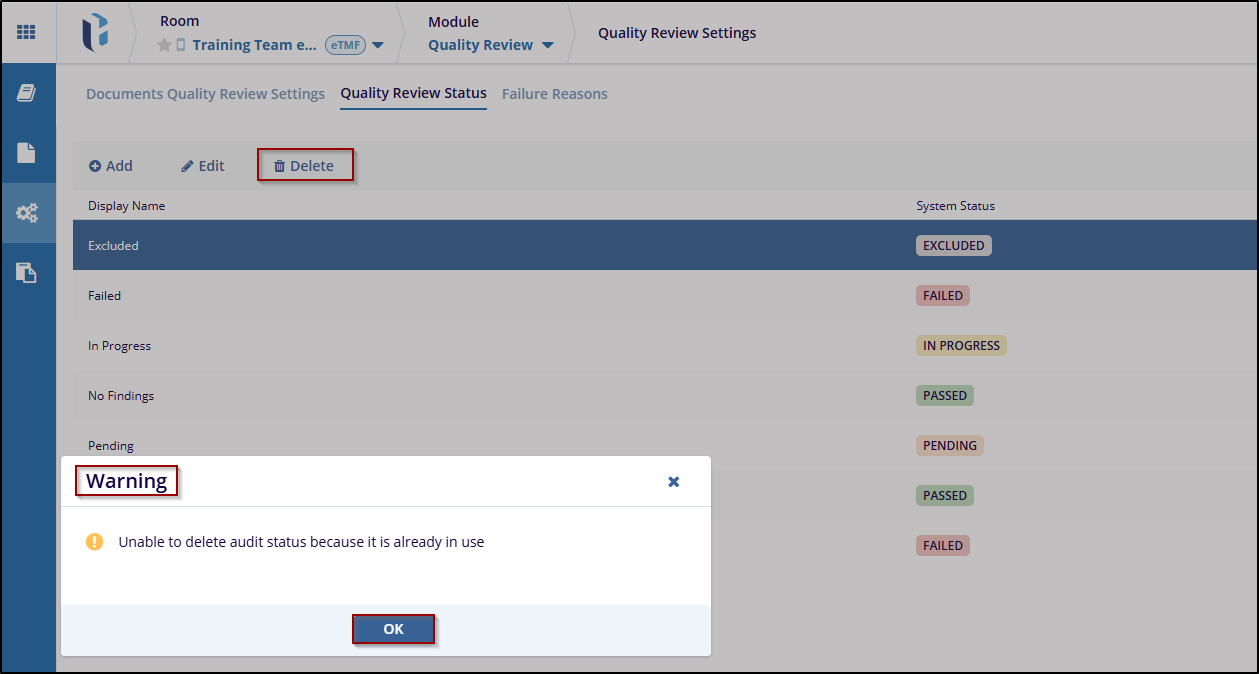 The Delete button is used to delete the available statuses in the quality review setting.