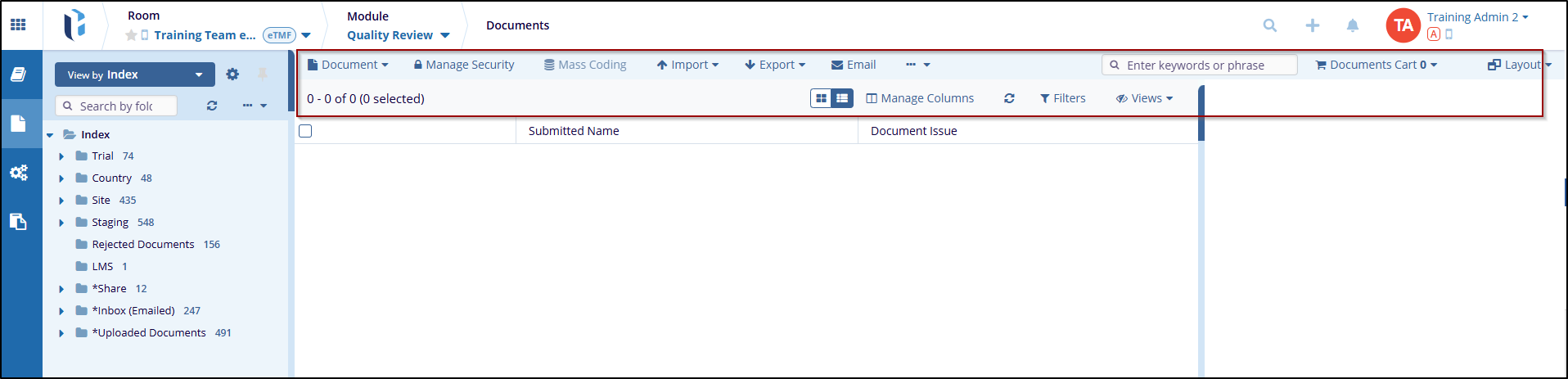 This menu is located at the top of the Document section, which includes Document, Manage Security, Mass Coding, Import, Etc.