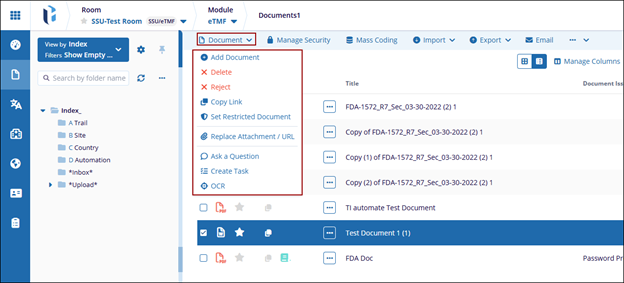 The options available in this dropdown menu are only available once a document has been selected in the grid and are a subset of the options available in the Document Activities menu mentioned in the section above.