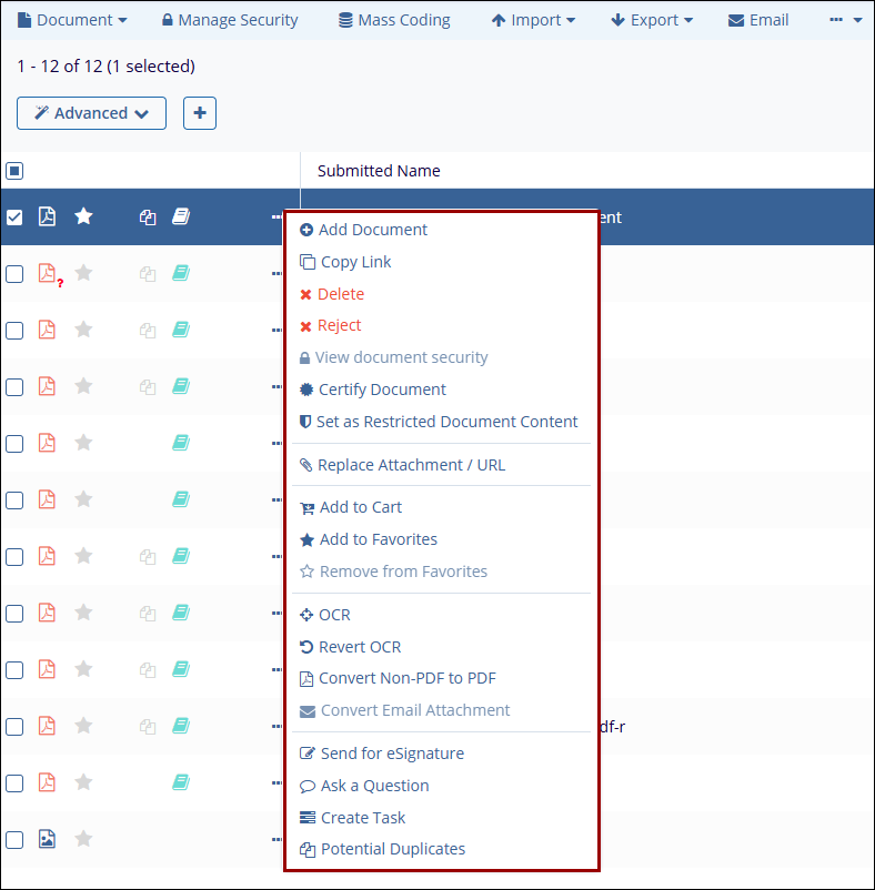 The Document Activities Menu provides access to various actions based on the user’s access rights. To open this menu, select a document or placeholder from the Grid and either right-click or click on the three-dot menu.