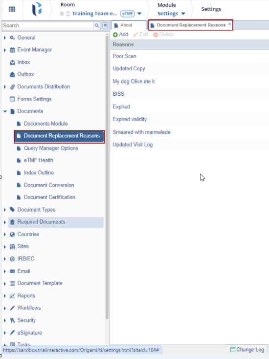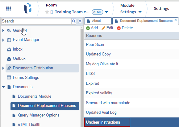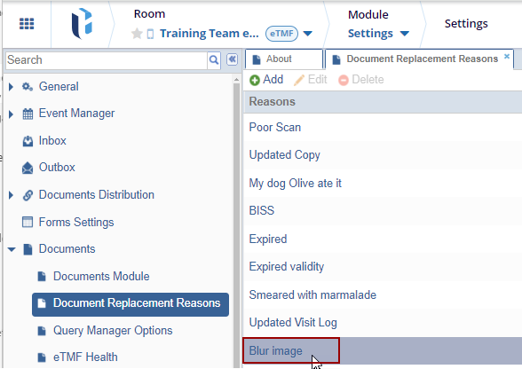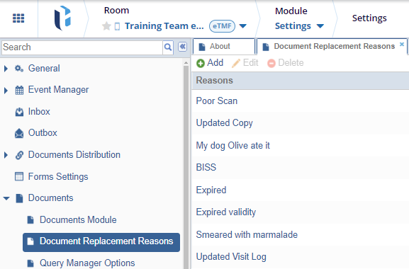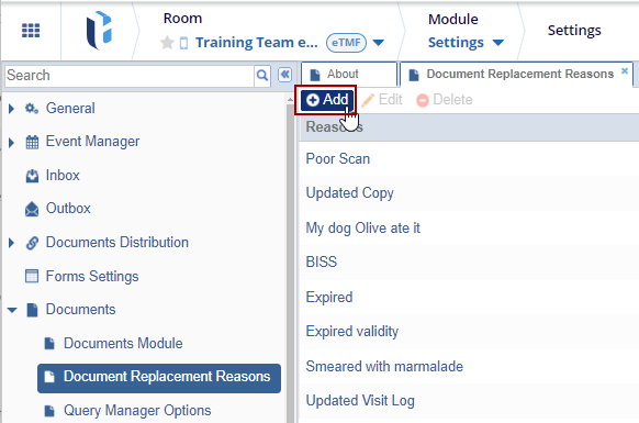 - Navigate to Navigation Grid->Settings -> Documents -> Document Replacement Reasons.