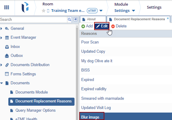 Select the reason from the available list of reasons and click ‘Edit’ from the top ribbon bar.