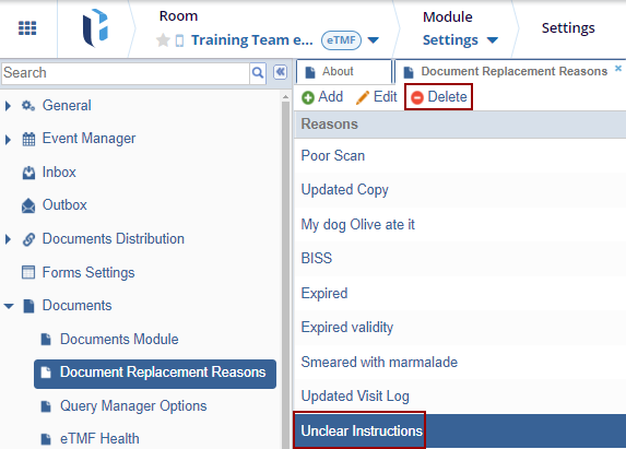 Select the reason from the available list of reasons and click ‘Delete’ from the top ribbon bar.