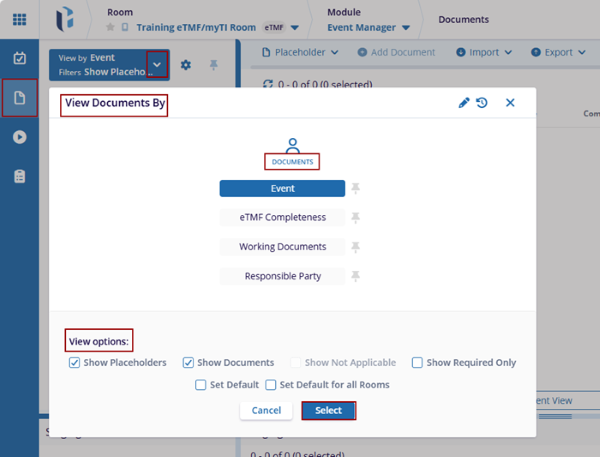 - Select the available documents views under four categories: Event eTMF, Completeness, Working, Documents, Responsible Party.