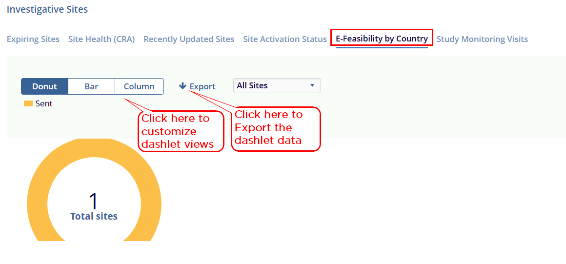 - The chart shows the total number of sites with feasibility assessments for each country. For example, the Donut chart format indicates 1 Total site in India with a feasibility status of "Sent."