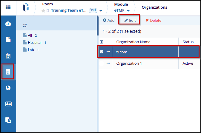 In the eTMF module, go to the sidebar and click on the Organizations modal.