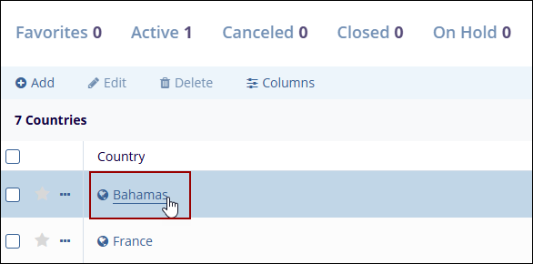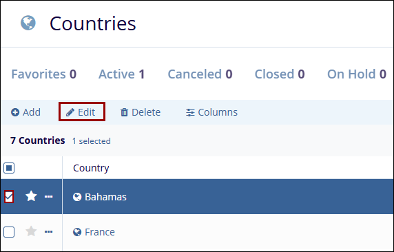 On the Countries screen, select the country to edit by checking the box next to its name.