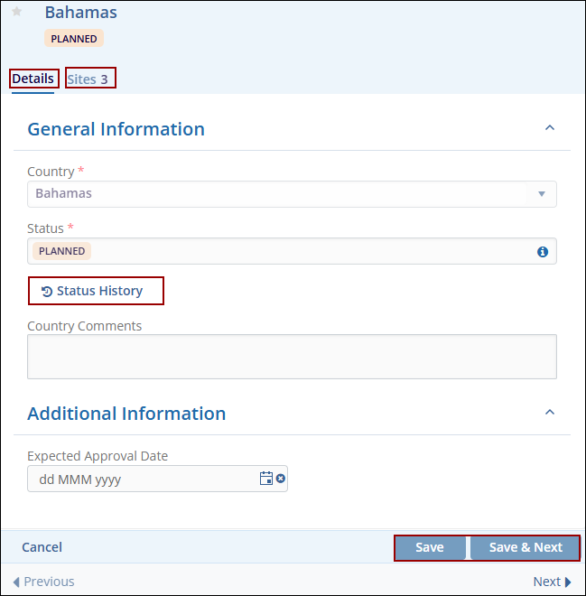 - Once the desired changes are made, click on the Save button to apply the updates, or the Save & Next button to edit the next country in the list.
