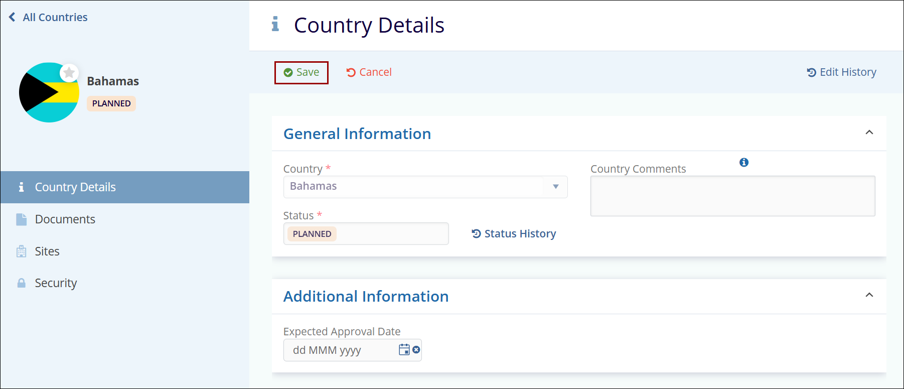 In the Edit Country panel, make the necessary changes under the Details tab.
