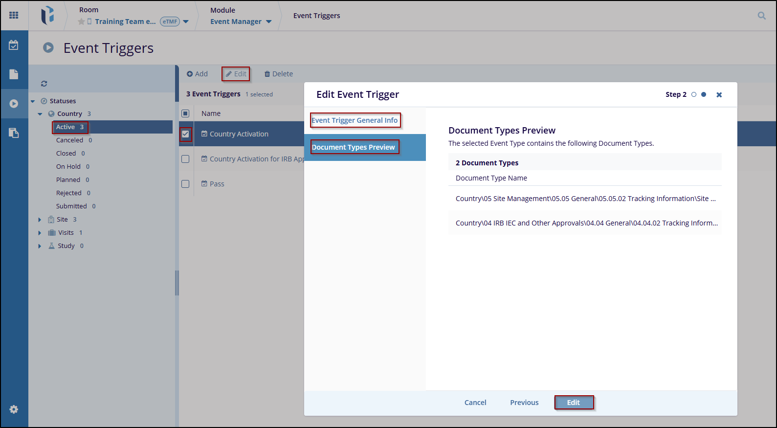 The Edit button in the Event Trigger allows user to edit the event type and the selected status.