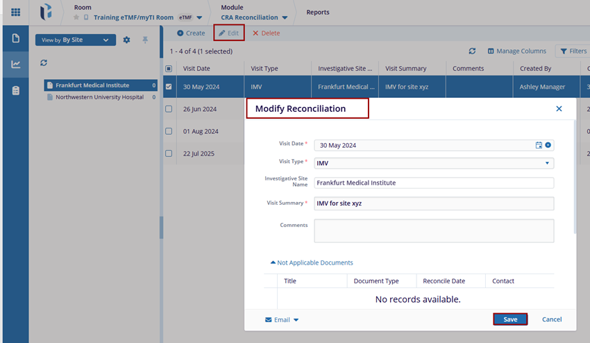 - A new Modify CRA TMF Reconciliation window will open, Update or change the required fields.