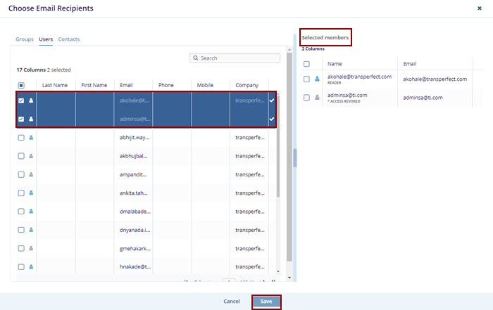 - Double-click on the Users, Groups, and Contacts from the list. The selected users were added to the right pane (Selected members) of the Choose Email Recipients screen.
